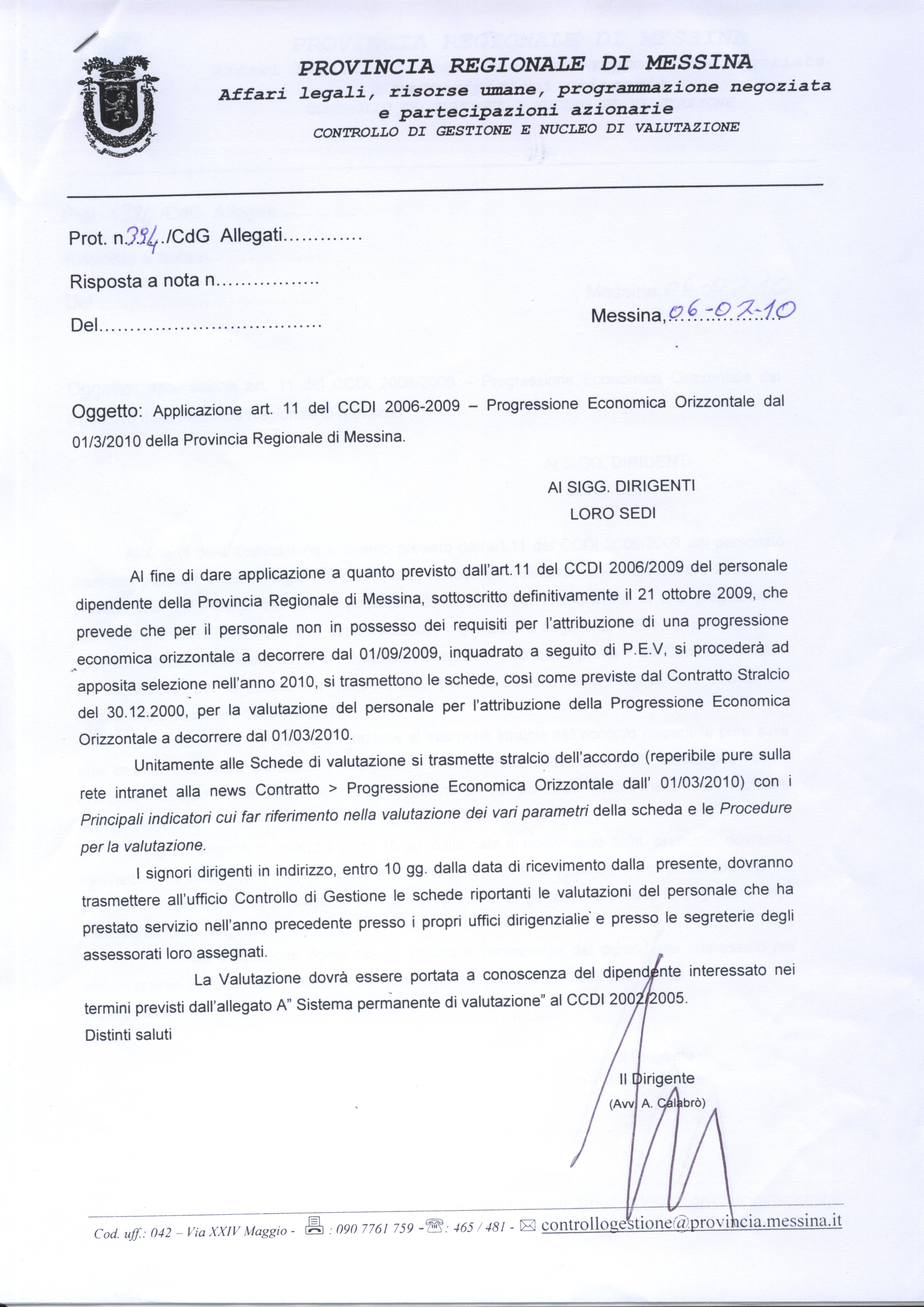 Contratto 2006-2009 Contratto 2006-2009 Pubblicato il: 10 settembre 2007 Ultima revisione: 22 ottobre 2013 Condividi Facebook Twitter Linkedin Whatsapp Azioni Stampa Invia Contratto Collettivo Decentrato Integrativo 2006-2009 della Provincia Regionale di Messina CCDI e schede di valutazione CONTRATTO DECENTRATO 2006-2009 All. A (sistema permanente di valutazione) 2009 All. B (produttività individuale e premio di risultato collettivo) 2009 All. C (attività finalizzate) 2009 All. D (sistema di valutazione delle posizioni organizzative) 2009 All. E (servizio di pronta reperibilità) 2009 All. G 2009 (Accordo Integrativo Fondo Assistenza Polizia Provinciale) modificato CIRCOLARE 7 BRUNETTA Delibera 151 costituzione fondo pers.dipend.2007_2008_2009 Posizioni Organizzative Scheda R3 Scheda V3 Indennita' ex art 18 CCDI 2006-2009 Modello art. 18 Fir Modello FIR 2012 relazione finale del Dirigente Modelli FIR 2012 - valutazioni e tabella di liquidazione Produttività Modello B2 mensile - Produttività 2013 Modelli B2, B3, B4, B5 e Prospetto riepilogativo - Produttività 2012 Progressione economica orizzontale CIRCOLARE PEO MARZO 2010 Criteri di valutazione progressione economica 2009 PEO - riferimento 1 PEO - riferimento 2 PEO - riferimento 3 PEO - riferimento 4 Attività finalizzate Modello C1 Modello C2 Modello C3