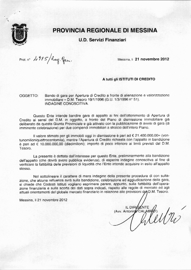 Avviso bando di gara per Apertura di Credito a fronte di alienazione e valorizzazione immobiliare - D.M. Tesoro 19/1/1996 (G.U. 1/3/1996, n. 51). Indagine conoscitiva.