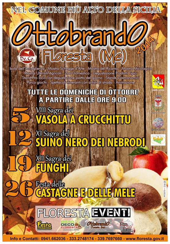 Si comunica che la VII Direzione "Sviluppo Economico" parteciperà alla manifestazione denominata ottobrando, che si terrà durante le quattro domeniche di ottobre, nel centro storico di Floresta. Trattasi di una mostra mercato dell'enogastronomia e della cucina tipica nebroidea: una festa d'autunno dove la Provincia parteciperà con proprio stand per propagandare e diffondere le tradizioni del proprio territorio.