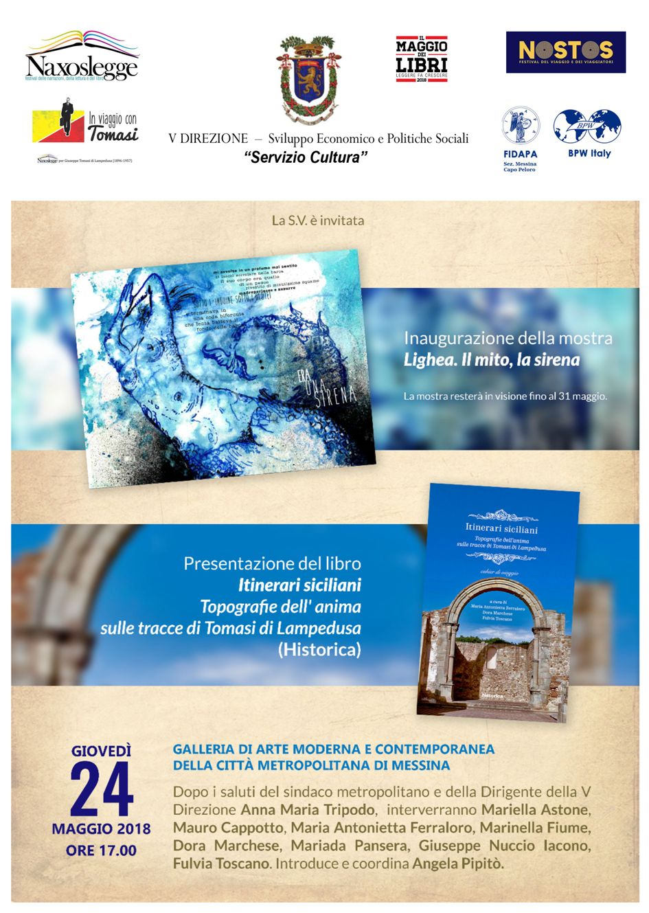 L’iniziativa, organizzata dal Servizio Cultura della Città Metropolitana di Messina in collaborazione con “Naxoslegge”, “Le Officine di Hermes” e la Fidapa Sez. Messina Capo Peloro BPW Italy, prevede, inoltre, in occasione della stessa presentazione del libro, l’inaugurazione della mostra del maestro Alessandro La Motta “Lighea. Il mito, la sirena”, inserita nell'ambito del più generale progetto itinerante “In viaggio con Tomasi” con cui “Naxoslegge” ha celebrato i sessanta anni dalla prima pubblicazione de Il Gattopardo.