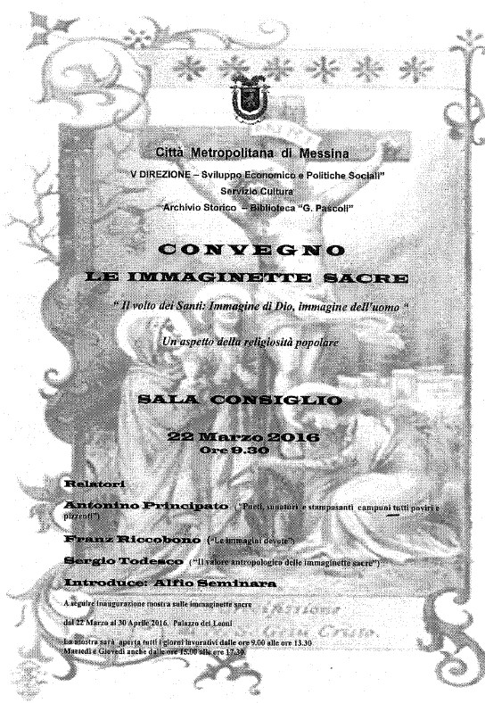 Questo il motivo conduttore del convegno dal titolo “Le immaginette sacre” in programma martedì 22 marzo 2016, alle ore 9.30, nella Sala Consiglio di Palazzo dei Leoni.