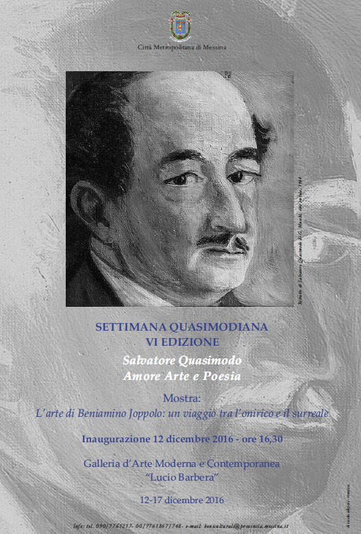 Prenderà avvio lunedì 12 dicembre, alle ore 16.30, negli spazi espositivi della Galleria d’Arte Moderna e Contemporanea “Lucio Barbera”, la VI edizione della “Settimana Quasimodiana”, organizzata dalla Direzione Cultura della Città Metropolitana di Messina.