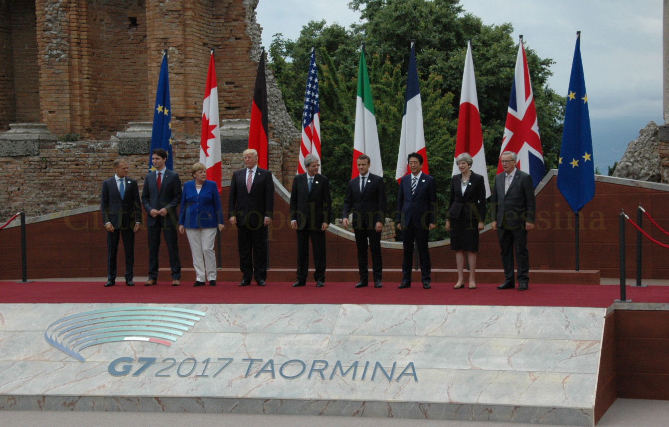 A salire sul palco per primo il Presidente della Commissione Europea, Jean-Claude Juncker, seguito dal Presidente del Consiglio europeo Donald Tusk, entrambi ospiti fissi del G7; ad aprire la passarella dei sette leader è stato il Primo Ministro giapponese Shinzō Abe seguito, in ordine, dal Primo Ministro inglese Theresa May, dal Cancelliere tedesco Angela Merkel, dal giovane Primo Ministro canadese Justin Trudeau, dal Presidente francesce Emmanuel Macron e, in chiusura, dal Presidente statunitense Donald Trump. Pochi minuti dedicati alla foto di gruppo ufficiale e poi tutti diretti all'Hotel San Domenico per l'apertura dei lavori del summit.