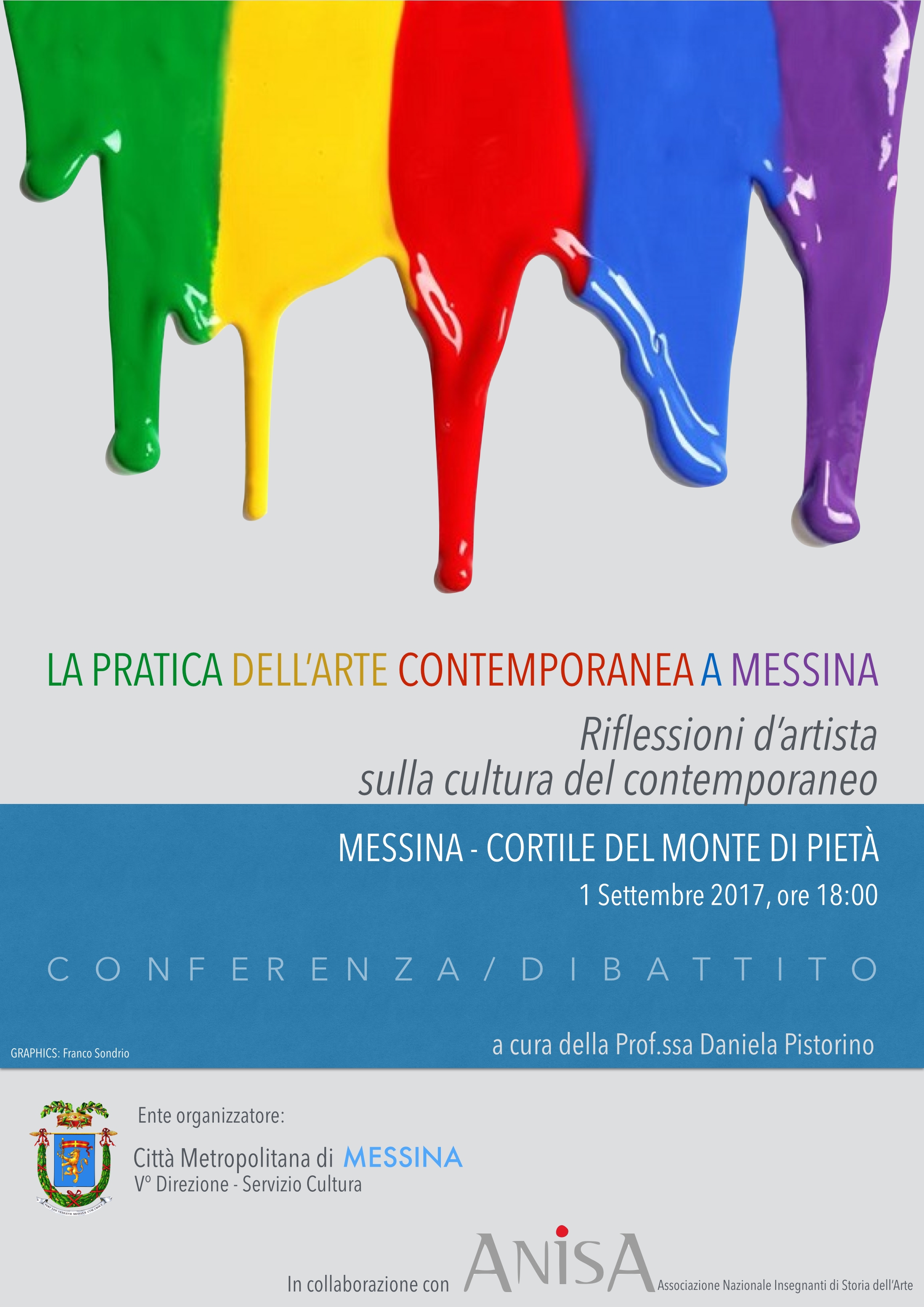Venerdì 1 settembre alle ore 18.00 presso il Monte di Pietà, la Città Metropolitana di Messina, V Direzione, Servizio Cultura, in collaborazione con l’ANISA Messina (Associazione Nazionale Insegnanti di storia dell’arte sez. di Messina) organizzerà la conferenza dal titolo “La pratica dell’Arte Contemporanea e Messina. Riflessioni d’artista sulla cultura del contemporaneo a Messina”.