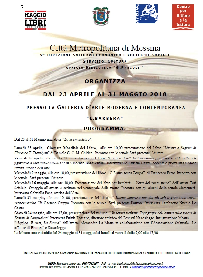 Ha inizio il 23 Aprile 2018 “Il Maggio dei Libri”, la campagna nazionale promossa dal Centro per il Libro e la Lettura del Ministero dei Beni e delle Attività Culturali e del Turismo, in collaborazione con il Ministero dell’Istruzione, dell’Università e della Ricerca, sotto l’Alto Patronato del Presidente della Repubblica e con il patrocinio della Commissione Nazionale Italiana per l’UNESCO. La Città Metropolitana di Messina anche quest'anno ha aderito alla manifestazione, giunta quest’anno alla VIII Edizione, il cui obiettivo è quello di sottolineare il valore sociale della lettura nella crescita personale, culturale e civile. lI Maggio dei Libri quest’anno, avrà inizio in tutto il territorio nazionale lunedì 23 aprile in occasione della Giornata Mondiale del Libro e si concluderà il 31 maggio 2018 coinvolgendo moltissime realtà: enti locali, scuole, biblioteche, associazioni culturali, Gallerie d'arte e Musei. Per tutta la durata del “Maggio dei Libri” sarà attiva l'iniziativa de “Lo Scambialibro”, che si fonda sul semplice sistema del baratto con libri messi a disposizione presso la Biblioteca della Città Metropolitana di Messina. Lo scambio è completamente gratuito e potrà avvenire più volte.