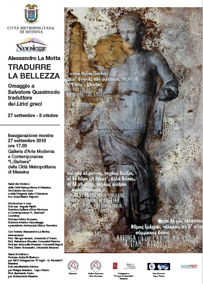 Continuano a ritmo serrato le celebrazioni quasimodiane organizzate in occasione del cinquantesimo anniversario della morte di Salvatore Quasimodo, Premio Nobel per la Letteratura nel 1959. “Tradurre la bellezza”, questo il titolo della mostra dell'artista Alessandro La Motta dedicata alle traduzioni dei lirici greci di Quasimodo e organizzata a cura del Servizio Cultura della Città Metropolitana di Messina, in collaborazione con Naxos Legge.