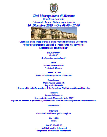 I lavori saranno introdotti e mediati dal Segretario generale e Responsabile della Prevenzione della Corruzione Città Metropolitana di Messina, Maria Angela Caponetti, mentre la relazione sarà svolta dal Segretario generale del Comune di Mazara del Vallo ed esperta nei processi di governance, formazione e innovazione della pubblica amministrazione, Antonella Marascia.
