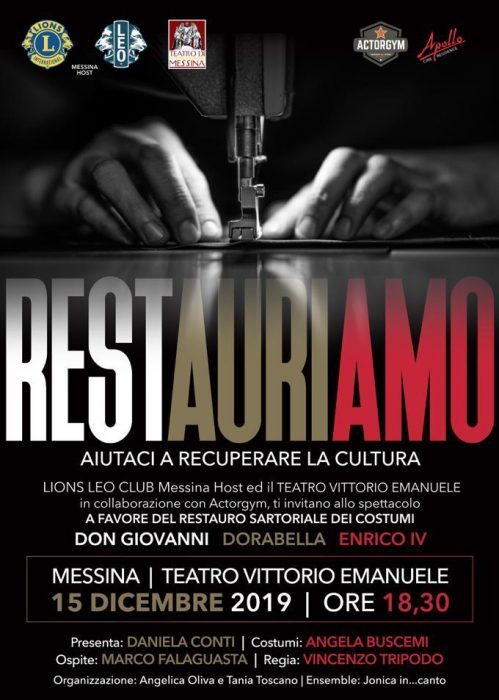 Domenica 15 dicembre 2019 alle ore 18:30 andrà in scena al Teatro Vittorio Emanuele lo spettacolo “Restauriamo - Aiutaci a recuperare la Cultura”, organizzato da Lions e Leo Club Host con il Teatro di Messina, in collaborazione con Actorgym.